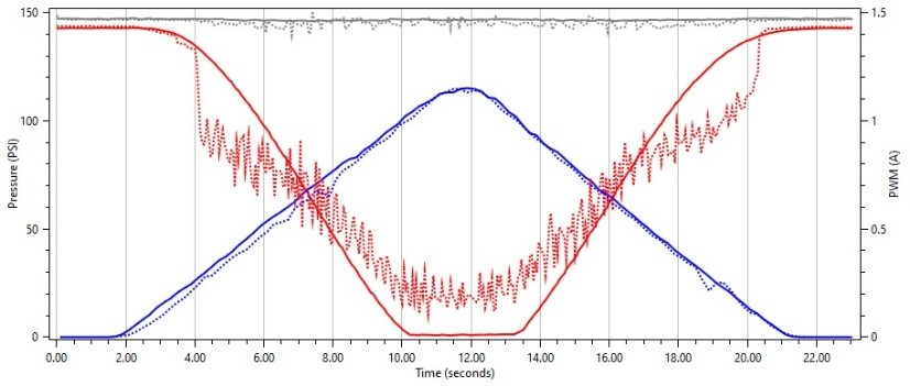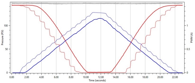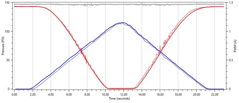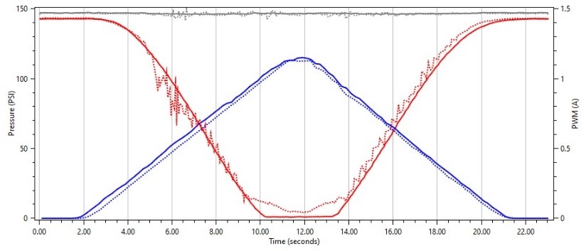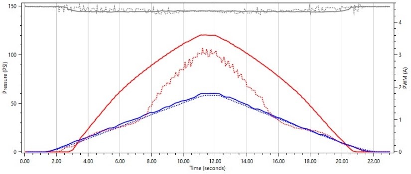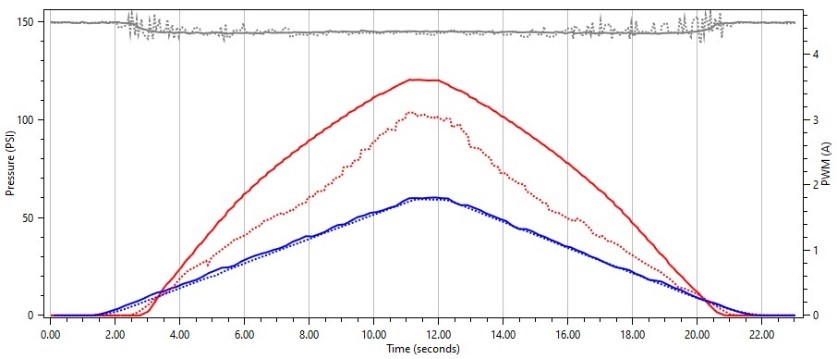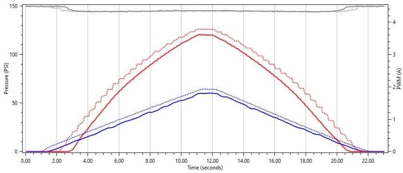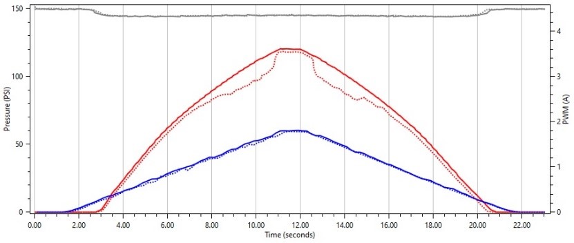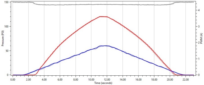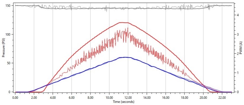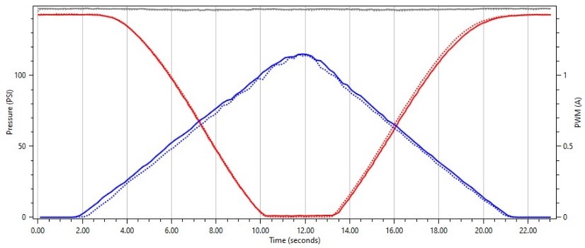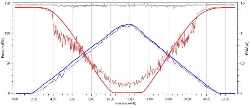 Interestingly enough, we see the same behavior on this solenoid when we use a frequency that is much higher that the OEM frequency. We see where the solenoid does not float and smoothly regulate pressure as we sweep our duty cycle up and down.